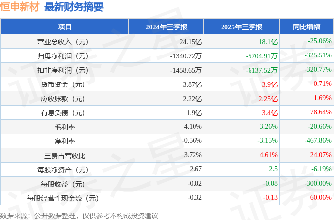 据证券之星公开数据整理,近期恒申新材(000782)发布2025年三季报。根据财报显示,恒申新材净利润同比下降325.51%。截至本报告期末,公司营业总收入18.1亿元,同比下降25.06%,归母净利润-5704.91万元,同比下降325.51%。按单季度数据看,第三季度营业总收入5.92亿元,同比下降25.53%,第三季度归母净利润-2035.08万元,同比下降569.86%。