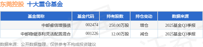 持有东莞控股最多的基金为中邮睿信增强债,目前规模为81.89亿元,最新净值1.383(10月30日),较上一交易日下跌0.5%,近一年上涨17.4%。该基金现任基金经理为闫宜乘。