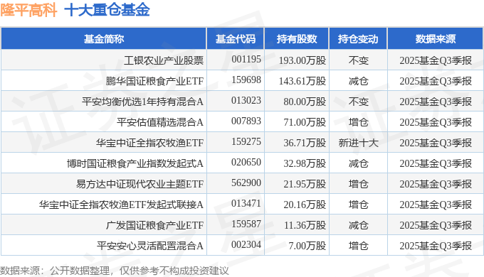 持有隆平高科最多的基金为工银农业产业股票,目前规模为4.39亿元,最新净值1.049(10月30日),较上一交易日下跌0.57%,近一年上涨11.52%。该基金现任基金经理为杨柯。
