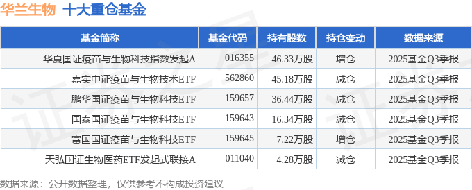 持有华兰生物最多的基金为华夏国证疫苗与生物科技指数发起A,目前规模为0.38亿元,最新净值0.7121(10月30日),较上一交易日下跌1.37%,近一年上涨2.2%。该基金现任基金经理为鲁亚运。