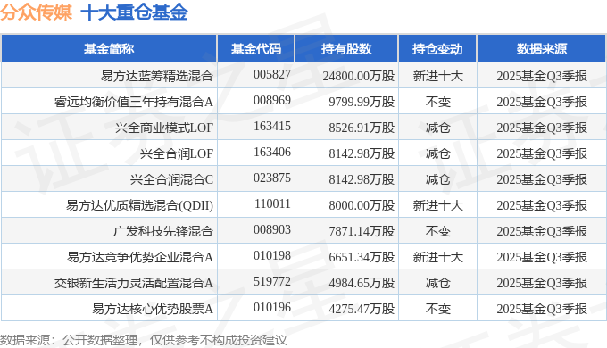 持有分众传媒最多的基金为易方达蓝筹精选混合,目前规模为364.13亿元,最新净值1.9862(10月29日),较上一交易日下跌0.35%,近一年上涨8.68%。该基金现任基金经理为张坤。