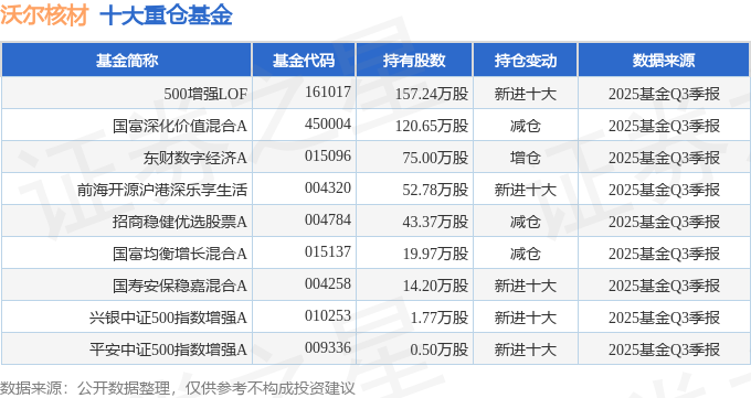 持有沃尔核材最多的基金为500增强LOF,目前规模为46.29亿元,最新净值2.464(10月30日),较上一交易日下跌1.56%,近一年上涨27.7%。该基金现任基金经理为李笑薇 方旻 汤杰强。