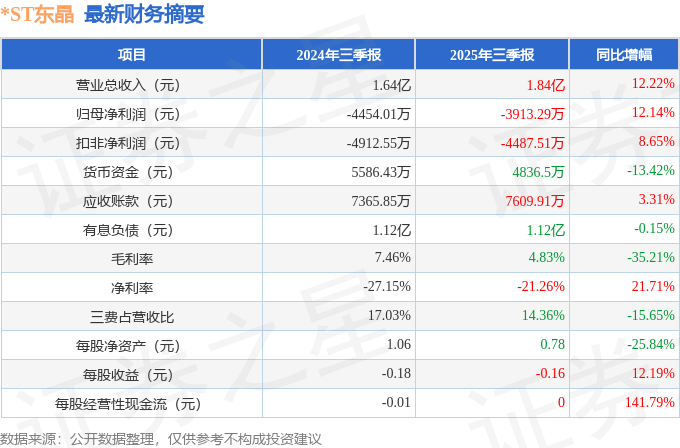 据证券之星公开数据整理,近期*ST东晶(002199)发布2025年三季报。根据财报显示,*ST东晶营收上升亏损收窄。截至本报告期末,公司营业总收入1.84亿元,同比上升12.22%,归母净利润-3913.29万元,同比上升12.14%。按单季度数据看,第三季度营业总收入6713.9万元,同比上升5.36%,第三季度归母净利润-780.52万元,同比上升30.51%。