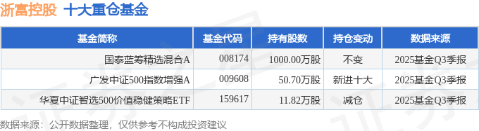 持有浙富控股最多的基金为国泰蓝筹精选混合A,目前规模为11.12亿元,最新净值1.3209(10月29日),较上一交易日上涨0.34%,近一年上涨15.12%。该基金现任基金经理为张容赫。