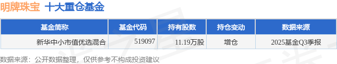持有明牌珠宝最多的基金为新华中小市值优选混合,目前规模为0.64亿元,最新净值3.2183(10月30日),较上一交易日下跌0.78%,近一年上涨38.61%。该基金现任基金经理为王永明。