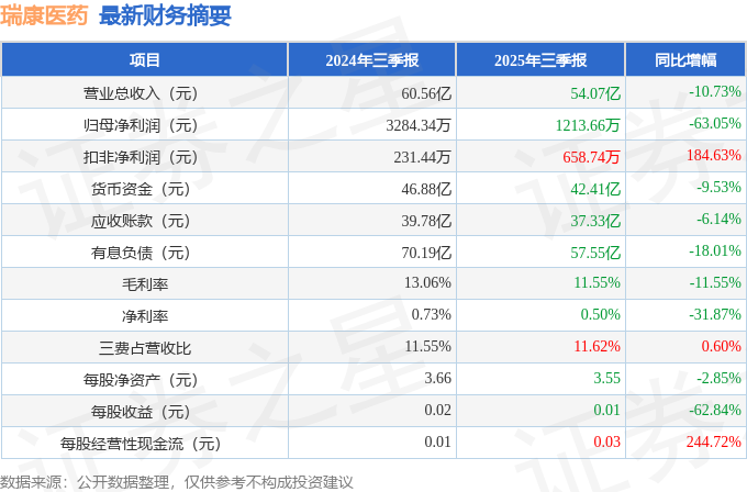 据证券之星公开数据整理,近期瑞康医药(002589)发布2025年三季报。根据财报显示,瑞康医药净利润同比下降63.05%。截至本报告期末,公司营业总收入54.07亿元,同比下降10.73%,归母净利润1213.66万元,同比下降63.05%。按单季度数据看,第三季度营业总收入18.63亿元,同比下降7.98%,第三季度归母净利润-602.98万元,同比下降200.65%。