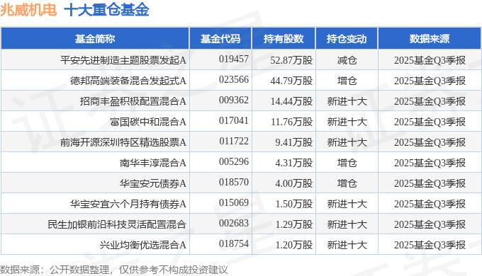 持有兆威机电最多的基金为平安先进制造主题股票发起A,目前规模为10.27亿元,最新净值1.9246(10月30日),较上一交易日下跌2.01%,近一年上涨98.33%。该基金现任基金经理为张荫先。