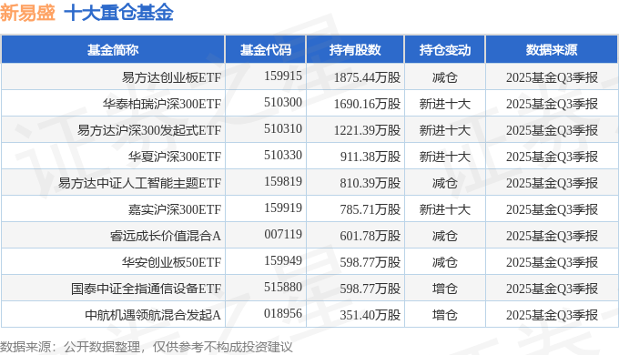持有新易盛最多的基金为易方达创业板ETF,目前规模为102.0亿元,最新净值3.2395(10月30日),较上一交易日下跌1.85%,近一年上涨54.51%。该基金现任基金经理为成曦 刘树荣。