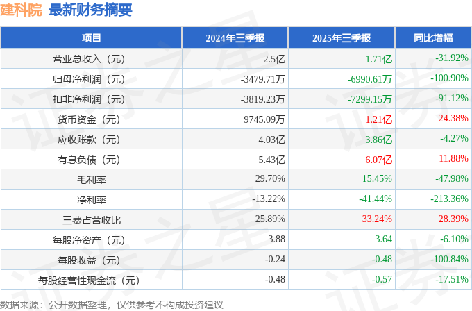 据证券之星公开数据整理,近期建科院(300675)发布2025年三季报。截至本报告期末,公司营业总收入1.71亿元,同比下降31.92%,归母净利润-6990.61万元,同比下降100.9%。按单季度数据看,第三季度营业总收入5388.74万元,同比下降44.53%,第三季度归母净利润-1654.09万元,同比下降188.06%。本报告期建科院公司应收账款体量较大,当期应收账款占最新年报归母净利润比达16057.9%。