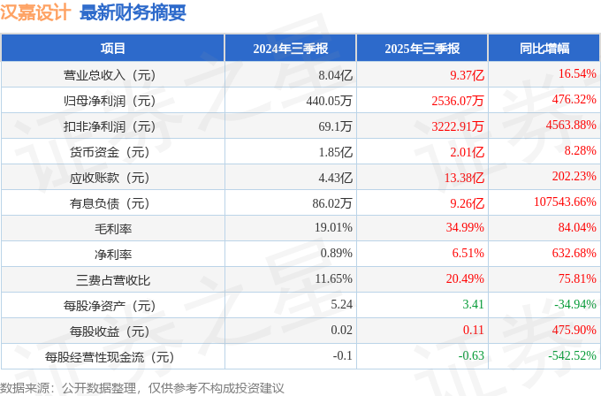 据证券之星公开数据整理,近期汉嘉设计(300746)发布2025年三季报。截至本报告期末,公司营业总收入9.37亿元,同比上升16.54%,归母净利润2536.07万元,同比上升476.32%。按单季度数据看,第三季度营业总收入3.04亿元,同比上升64.0%,第三季度归母净利润1033.34万元,同比上升1419.0%。本报告期汉嘉设计三费占比上升明显,财务费用、销售费用和管理费用总和占总营收同比增幅达75.81%。