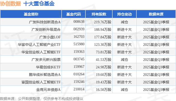 持有协创数据最多的基金为广发科技创新混合A,目前规模为31.41亿元,最新净值2.4692(10月29日),较上一交易日上涨1.83%,近一年上涨53.77%。该基金现任基金经理为吴远怡。