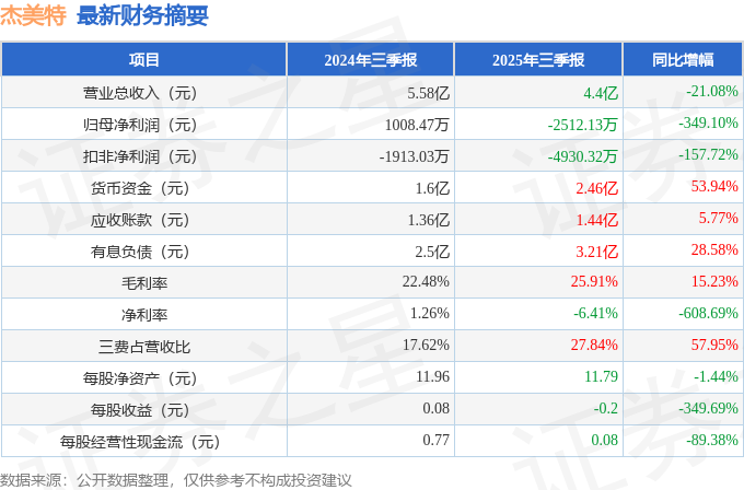 据证券之星公开数据整理,近期杰美特(300868)发布2025年三季报。截至本报告期末,公司营业总收入4.4亿元,同比下降21.08%,归母净利润-2512.13万元,同比下降349.1%。按单季度数据看,第三季度营业总收入1.49亿元,同比上升17.6%,第三季度归母净利润-1521.74万元,同比下降78.02%。本报告期杰美特三费占比上升明显,财务费用、销售费用和管理费用总和占总营收同比增幅达57.95%。