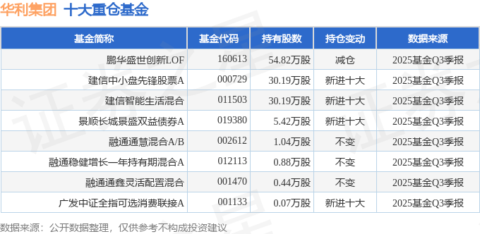 持有华利集团最多的基金为鹏华盛世创新LOF,目前规模为8.83亿元,最新净值1.3314(10月30日),较上一交易日上涨0.08%,近一年上涨18.32%。该基金现任基金经理为伍旋。