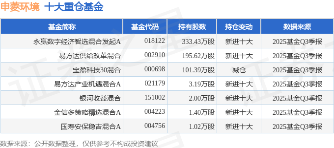 持有申菱环境最多的基金为永赢数字经济智选混合发起A,目前规模为6.17亿元,最新净值1.7333(10月30日),较上一交易日下跌1.42%,近一年上涨103.3%。该基金现任基金经理为王文龙。