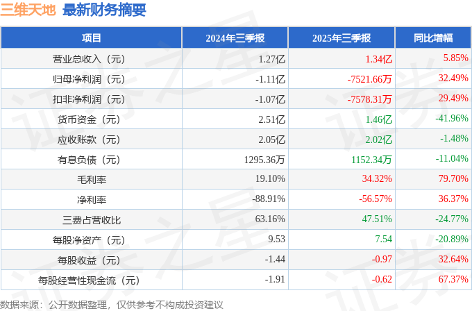 据证券之星公开数据整理,近期三维天地(301159)发布2025年三季报。截至本报告期末,公司营业总收入1.34亿元,同比上升5.85%,归母净利润-7521.66万元,同比上升32.49%。按单季度数据看,第三季度营业总收入6490.64万元,同比上升7.21%,第三季度归母净利润-1463.98万元,同比上升65.56%。本报告期三维天地盈利能力上升,毛利率同比增幅79.7%,净利率同比增幅36.37%。