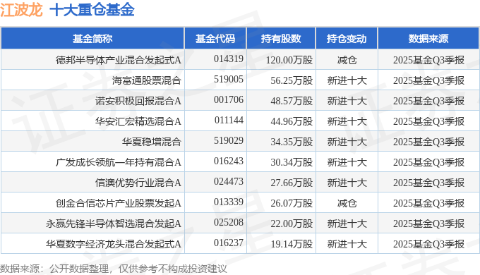 持有江波龙最多的基金为德邦半导体产业混合发起式A,目前规模为6.63亿元,最新净值2.0691(10月29日),较上一交易日上涨1.11%,近一年上涨94.1%。该基金现任基金经理为雷涛。