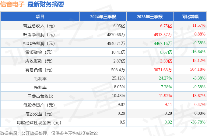 据证券之星公开数据整理,近期信音电子(301329)发布2025年三季报。截至本报告期末,公司营业总收入6.75亿元,同比上升11.57%,归母净利润4913.57万元,同比上升0.88%。按单季度数据看,第三季度营业总收入2.37亿元,同比上升11.48%,第三季度归母净利润1604.09万元,同比上升39.14%。本报告期信音电子公司应收账款体量较大,当期应收账款占最新年报归母净利润比达485.47%。