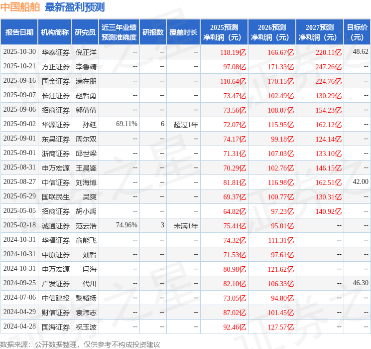 东吴证券股份有限公司周尔双,韦译捷近期对中国船舶进行研究并发布了研究报告《2025年 三 季 报 点 评:Q3归 母 净 利 润 同 比+98%符合预期,南北船合并落地》,给予中国船舶买入评级。
