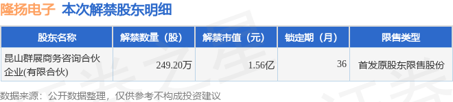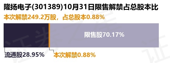 证券之星消息,根据市场公开信息整理,隆扬电子(301389)于10月31日将有249.2万股限售股份解禁,为公司首发原股东限售股份,占公司总股本0.88%。(本次数据根据历史公告整理得出,实际情况以上市公司最新公告为准)本次解禁后,公司还有1.99亿股限售股份,占总股本70.17%。具体如下图所示: