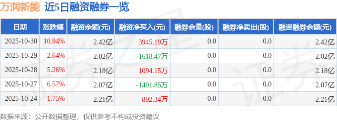 万润新能融资融券信息显示,融资方面,当日融资买入9966.53万元,融资偿还6021.34万元,融资净买入3945.19万元。融券方面,融券卖出0.0股,融券偿还0.0股,融券余量0.0股,融券余额0.0万元。融资融券余额2.42亿元。