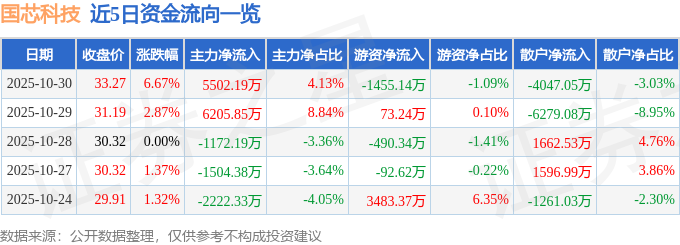 证券之星消息,截至2025年10月30日收盘,国芯科技(688262)报收于33.27元,上涨6.67%,换手率12.06%,成交量40.52万手,成交额13.34亿元。