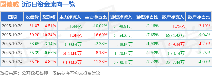 证券之星消息,截至2025年10月30日收盘,固德威(688390)报收于61.87元,上涨4.51%,换手率9.28%,成交量22.56万手,成交额14.33亿元。