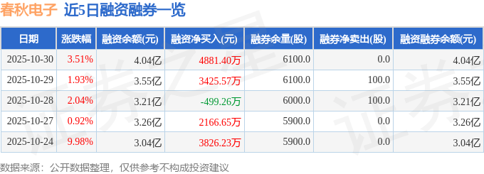 春秋电子融资融券信息显示,融资方面,当日融资买入1.84亿元,融资偿还1.35亿元,融资净买入4881.4万元。融券方面,融券卖出0.0股,融券偿还0.0股,融券余量6100.0股,融券余额9.35万元。融资融券余额4.04亿元。