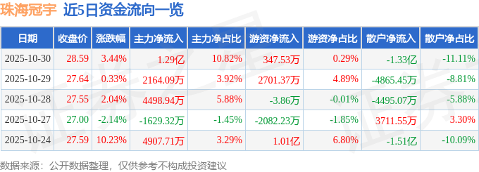 10月30日的资金流向数据方面,主力资金净流入1.29亿元,占总成交额10.82%,游资资金净流入347.53万元,占总成交额0.29%,散户资金净流出1.33亿元,占总成交额11.11%。