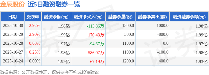 金辰股份融资融券信息显示,融资方面,当日融资买入1950.12万元,融资偿还2063.98万元,融资净偿还113.86万元。融券方面,融券卖出1000.0股,融券偿还0.0股,融券余量1300.0股,融券余额3.85万元。融资融券余额1.98亿元。