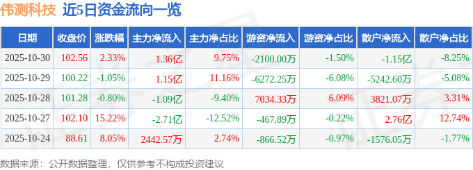 证券之星消息,截至2025年10月30日收盘,伟测科技(688372)报收于102.56元,上涨2.33%,换手率9.09%,成交量13.54万手,成交额14.0亿元。