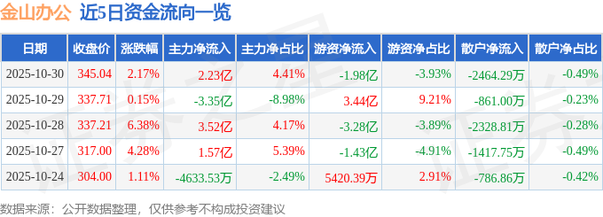 证券之星消息,截至2025年10月30日收盘,金山办公(688111)报收于345.04元,上涨2.17%,换手率3.12%,成交量14.45万手,成交额50.43亿元。