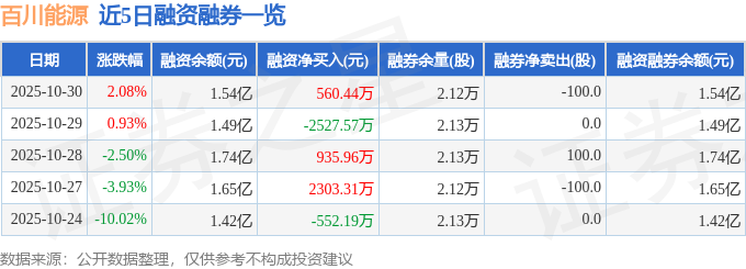 百川能源融资融券信息显示,融资方面,当日融资买入5412.74万元,融资偿还4852.3万元,融资净买入560.44万元。融券方面,融券卖出0.0股,融券偿还100.0股,融券余量2.12万股,融券余额9.37万元。融资融券余额1.54亿元。