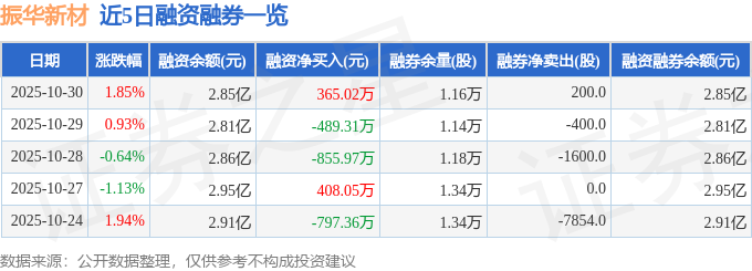 振华新材融资融券信息显示,融资方面,当日融资买入1659.35万元,融资偿还1294.33万元,融资净买入365.02万元。融券方面,融券卖出400.0股,融券偿还200.0股,融券余量1.16万股,融券余额16.64万元。融资融券余额2.85亿元。