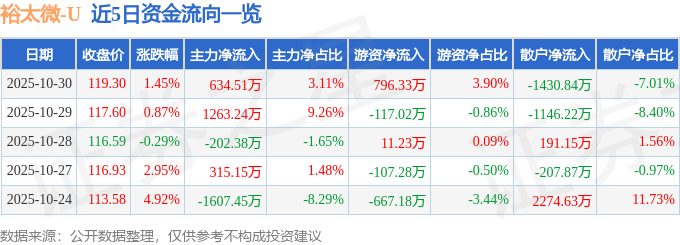 证券之星消息,截至2025年10月30日收盘,裕太微(688515)报收于119.3元,上涨1.45%,换手率3.43%,成交量1.71万手,成交额2.04亿元。