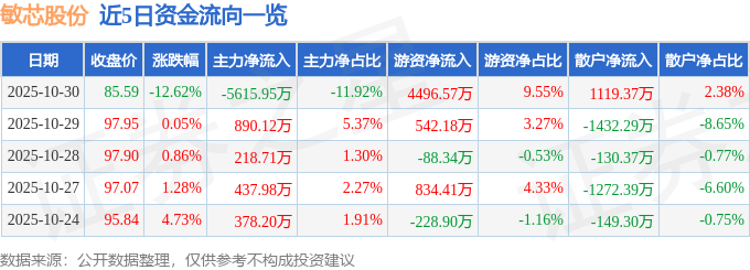 证券之星消息,截至2025年10月30日收盘,敏芯股份(688286)报收于85.59元,下跌12.62%,换手率9.52%,成交量5.34万手,成交额4.71亿元。