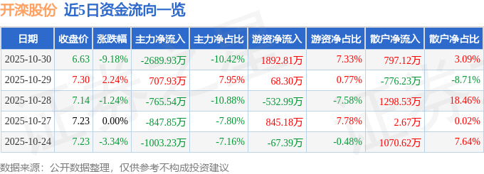 证券之星消息,截至2025年10月30日收盘,开滦股份(600997)报收于6.63元,下跌9.18%,换手率2.4%,成交量38.09万手,成交额2.58亿元。