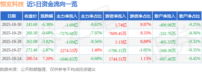 证券之星消息,截至2025年10月30日收盘,恒玄科技(688608)报收于243.68元,下跌6.38%,换手率4.69%,成交量7.91万手,成交额19.66亿元。