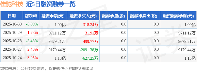 佳驰科技融资融券信息显示,融资方面,当日融资买入958.48万元,融资偿还640.24万元,融资净买入318.24万元,连续3日净买入累计849.92万元。融券方面,融券卖出0.0股,融券偿还0.0股,融券余量0.0股,融券余额0.0万元。融资融券余额1.0亿元。