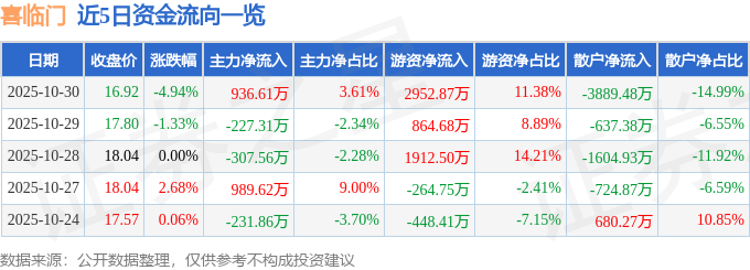 10月30日的资金流向数据方面,主力资金净流入936.61万元,占总成交额3.61%,游资资金净流入2952.87万元,占总成交额11.38%,散户资金净流出3889.48万元,占总成交额14.99%。
