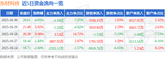 证券之星消息,截至2025年10月30日收盘,东材科技(601208)报收于20.61元,下跌4.05%,换手率7.5%,成交量76.39万手,成交额16.04亿元。