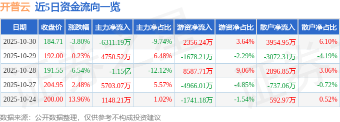 证券之星消息,截至2025年10月30日收盘,开普云(688228)报收于184.71元,下跌3.8%,换手率5.08%,成交量3.43万手,成交额6.48亿元。