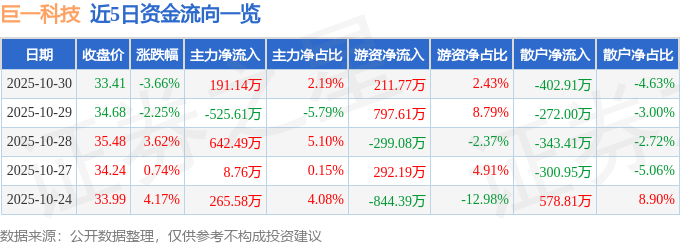 证券之星消息,截至2025年10月30日收盘,巨一科技(688162)报收于33.41元,下跌3.66%,换手率1.88%,成交量2.58万手,成交额8711.1万元。