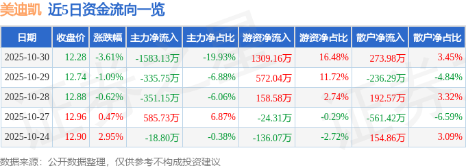 证券之星消息,截至2025年10月30日收盘,美迪凯(688079)报收于12.28元,下跌3.61%,换手率1.61%,成交量6.42万手,成交额7941.64万元。