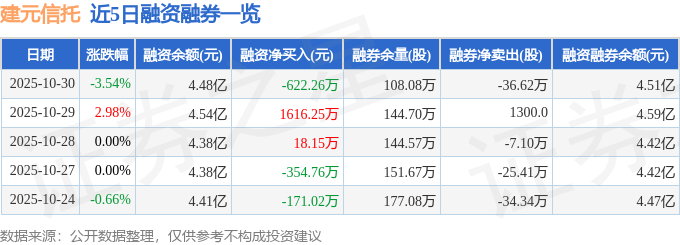 建元信托融资融券信息显示,融资方面,当日融资买入2538.71万元,融资偿还3160.97万元,融资净偿还622.26万元。融券方面,融券卖出1.15万股,融券偿还37.77万股,融券余量108.08万股,融券余额324.24万元。融资融券余额4.51亿元。