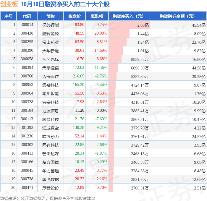 创业板融资净买入前三分别为:亿纬锂能(300014)融资净买入2.88亿元、鹏辉能源(300438)融资净买入1.44亿元、常山药业(300255)融资净买入1.24亿元,前20具体见下表:
