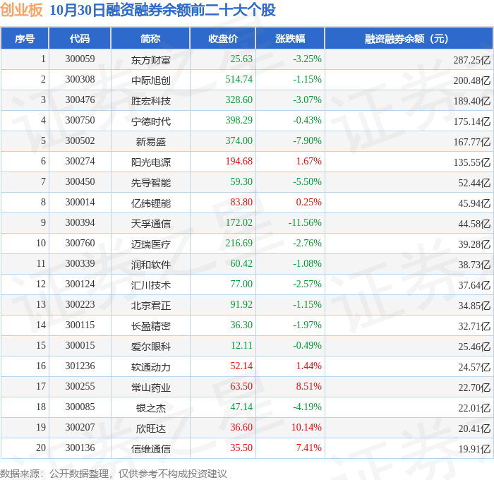 创业板融资融券余额前三分别为:东方财富(300059)融资融券余额287.25亿元、中际旭创(300308)融资融券余额200.48亿元、胜宏科技(300476)融资融券余额189.4亿元,前20具体见下表: