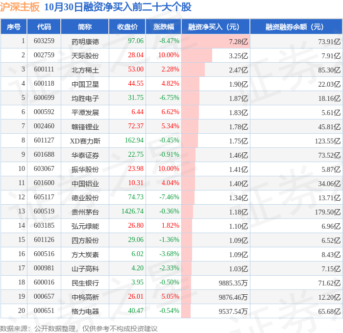 沪深主板融资净买入前三分别为:药明康德(603259)融资净买入7.28亿元、天际股份(002759)融资净买入3.25亿元、北方稀土(600111)融资净买入2.47亿元,前20具体见下表: