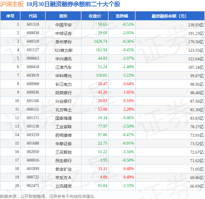 沪深主板融资融券余额前三分别为:中国平安(601318)融资融券余额238.93亿元、中信证券(600030)融资融券余额191.23亿元、贵州茅台(600519)融资融券余额179.5亿元,前20具体见下表: