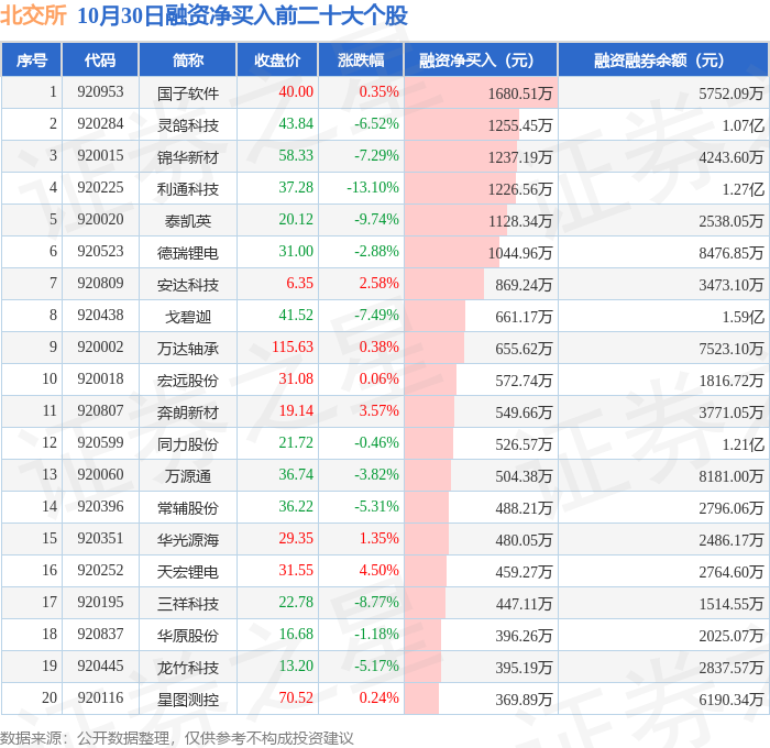 北交所融资净买入前三分别为:国子软件(920953)融资净买入1680.51万元、灵鸽科技(920284)融资净买入1255.45万元、锦华新材(920015)融资净买入1237.19万元,前20具体见下表:
