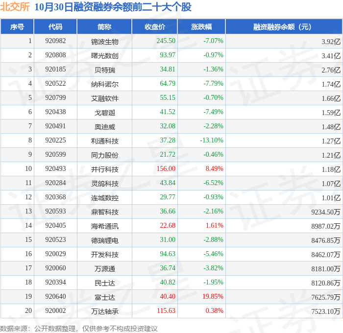 北交所融资融券余额前三分别为:锦波生物(920982)融资融券余额3.92亿元、曙光数创(920808)融资融券余额3.41亿元、贝特瑞(920185)融资融券余额2.76亿元,前20具体见下表: